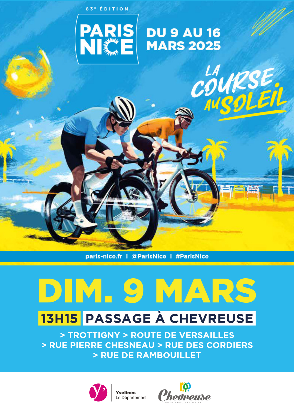 Le Paris-Nice sera de passage à Chevreuse ce dimanche 9 mars, entre 13h15 et 13h30. Itinéraire des coureurs : route de Versailles, rue P. Chesneau, rue des Cordiers, rue de Rambouillet, route de Rambouillet. Ces axes, ainsi que l’accès au parking de la Mare aux canards, seront fermés à la circulation entre 12h30 et 14h environ.