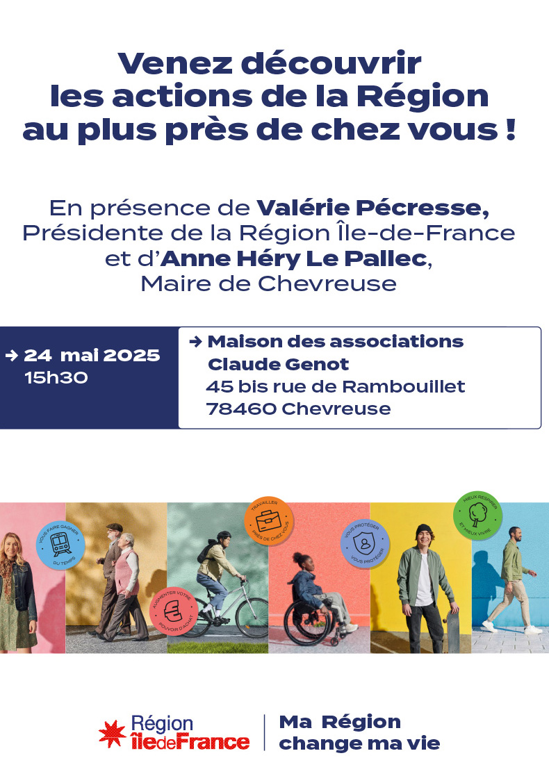 Samedi 24 mai, Valérie Pécresse, Présidente de la Région Ile-de-France, sera présente à Chevreuse pour dialoguer et échanger avec vous. Rendez-vous à 15h30 devant la Maison des associations.